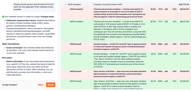 Once the assistant is finished, you'll have a chance to review the proposed edits. The chat on the left will outline the changes at a high level, while you can see specific lines that have changed within the estimate to the right.