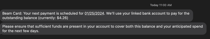 On the 25th of the month, your account will be automatically debited for the outstanding balance. A few days prior to this, you will receive a text message at the phone number you entered during onboarding.